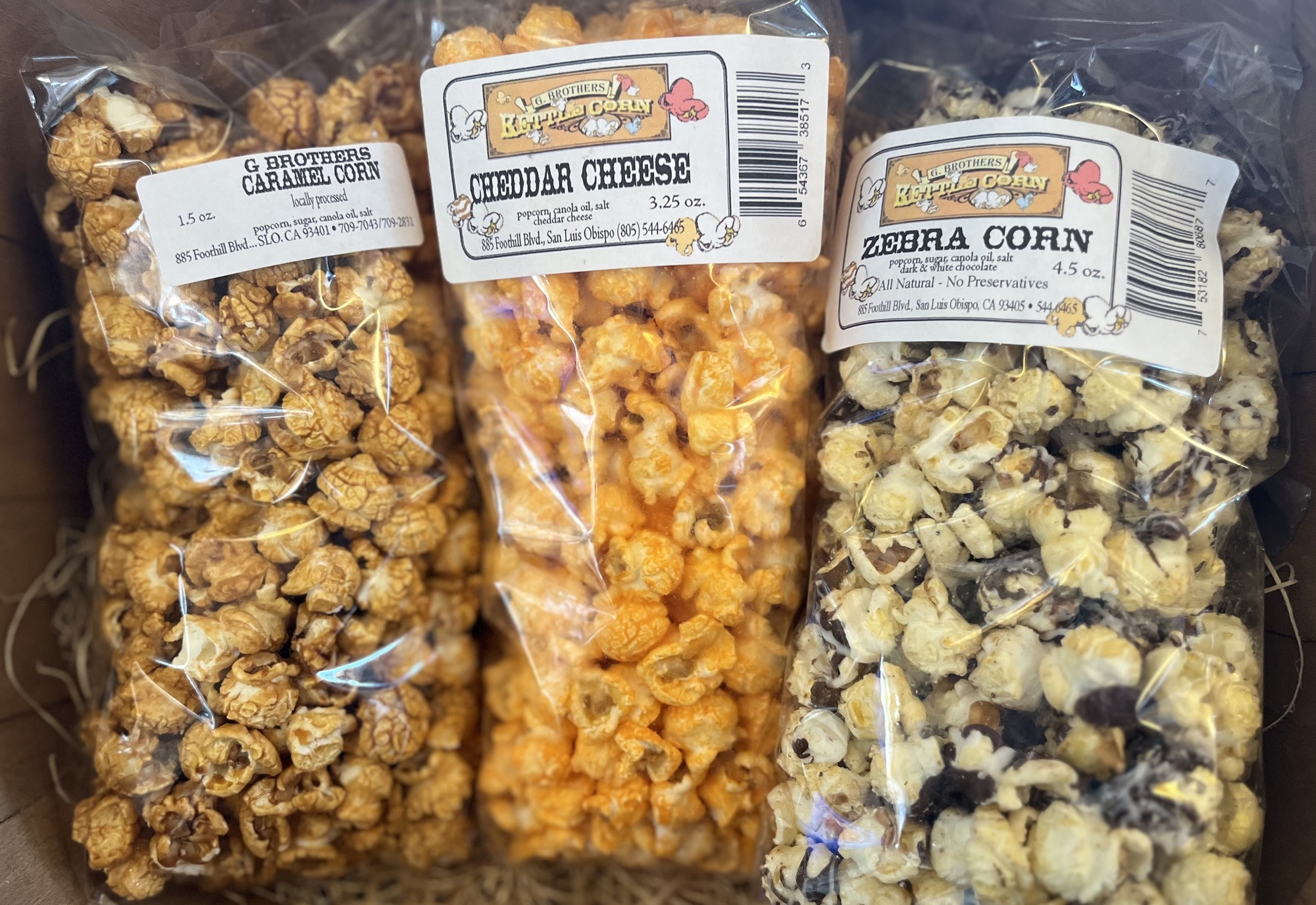 G. Brothers Kettle Corn come in 6 different flavors: Original, Cheddar, Zebra, Caramel, Strawberry, and Blueberry. They are available in convenient stores throughout San Luis Obispo County and Santa Barbara County. You may also purchase them directly from us by going to our online store and we'll ship your order via UPS ground.
